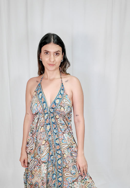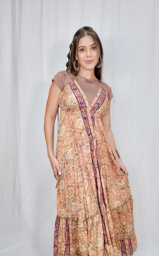 Vestido Largo Boleros Escote Profundo Beige/Multicolor