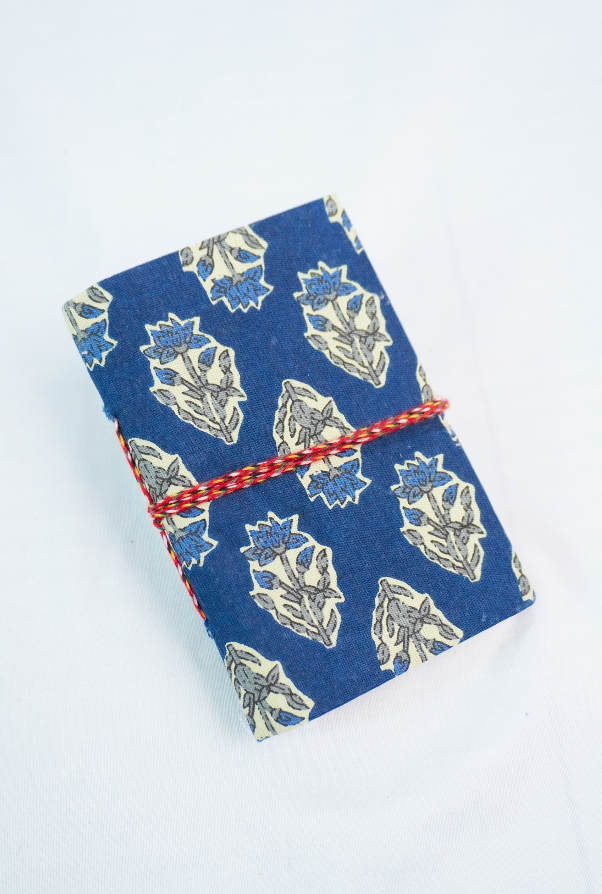 Este cuaderno, elaborado con papel 100% reciclado, es un homenaje al arte y la sostenibilidad. Su portada está hecha de suave algodón con un exquisito diseño *block print* de la India, una técnica artesanal que refleja siglos de tradición y belleza.