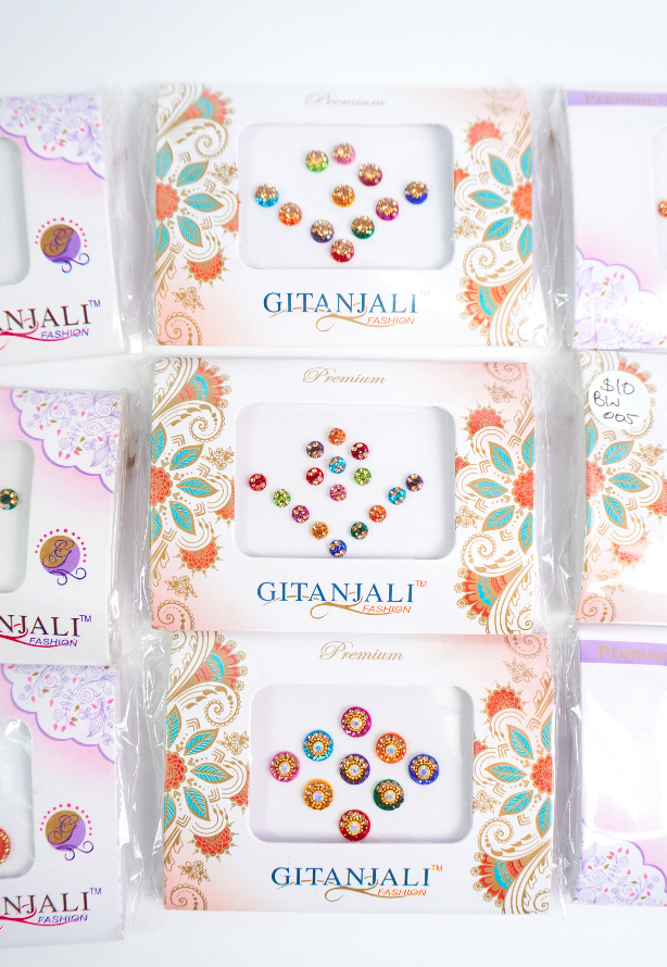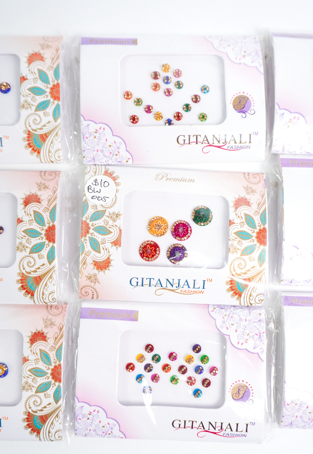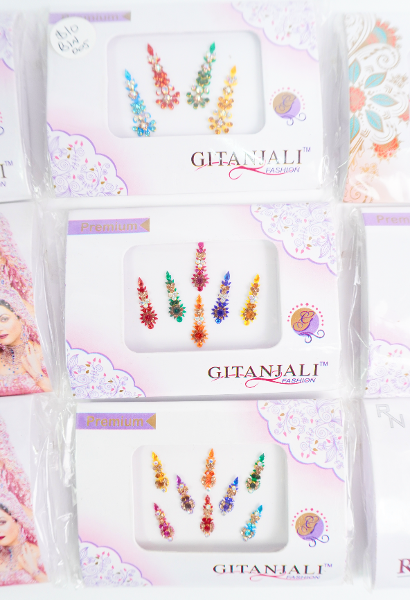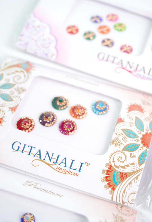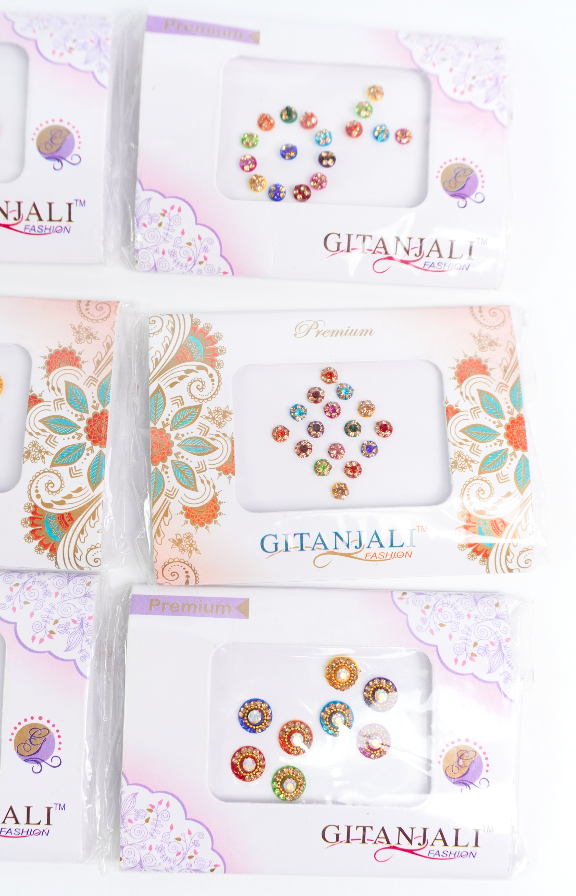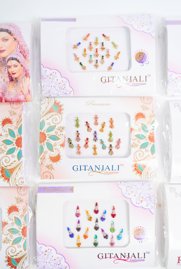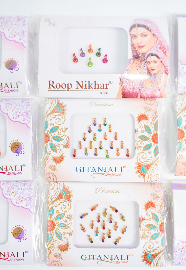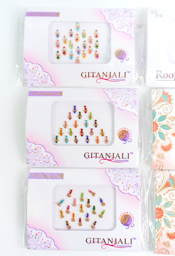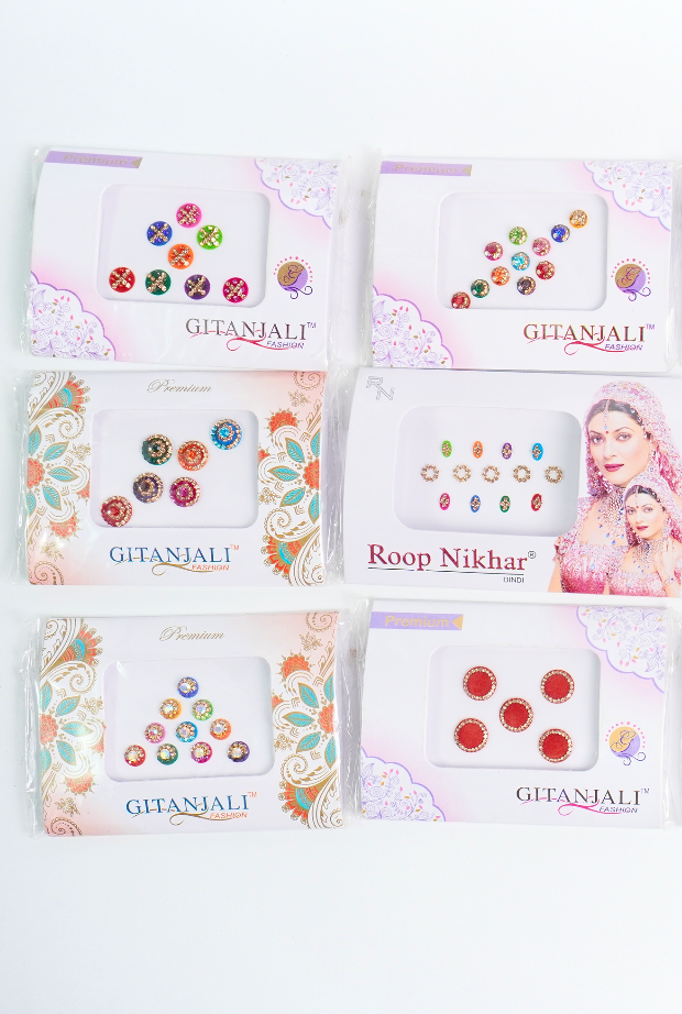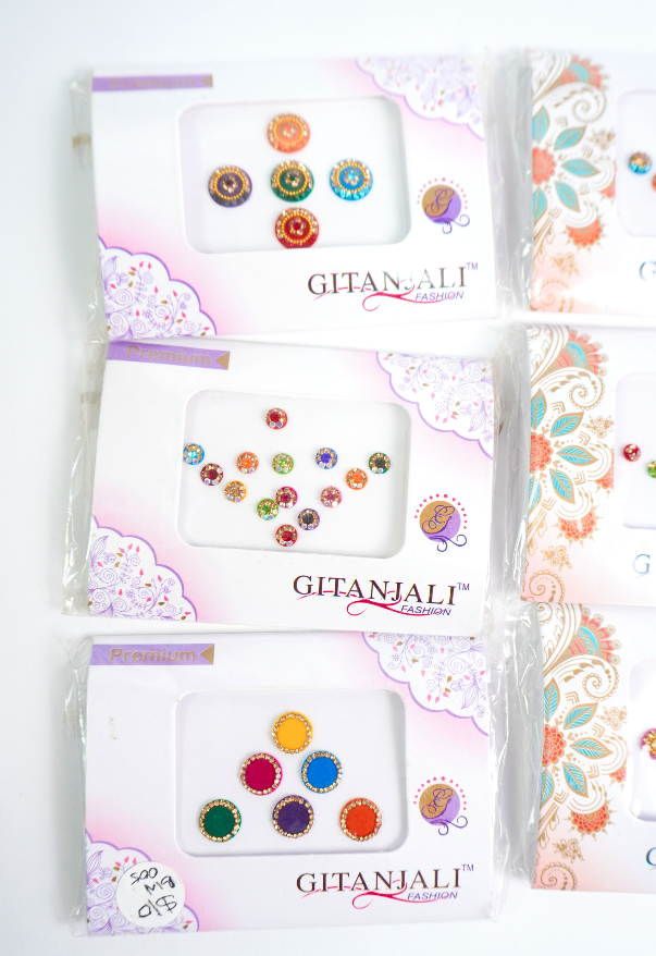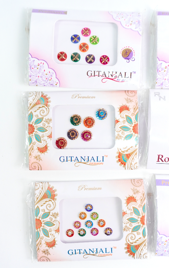 Bindis en diferentes tamaños, formas y colores.