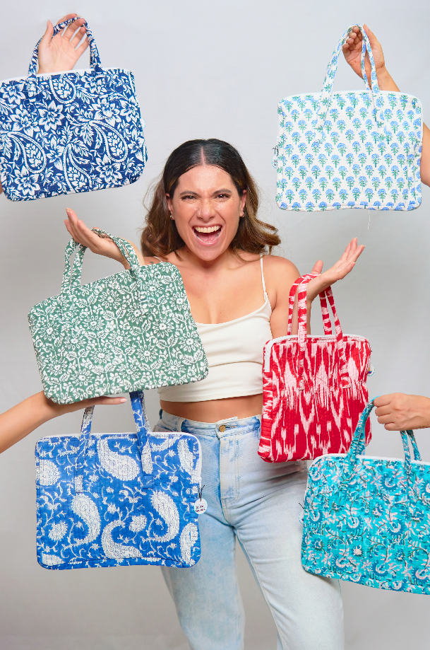 Protege tu iPad con estilo y autenticidad con nuestro estuche delgado o bolso hecho en block print de algodón de la India.