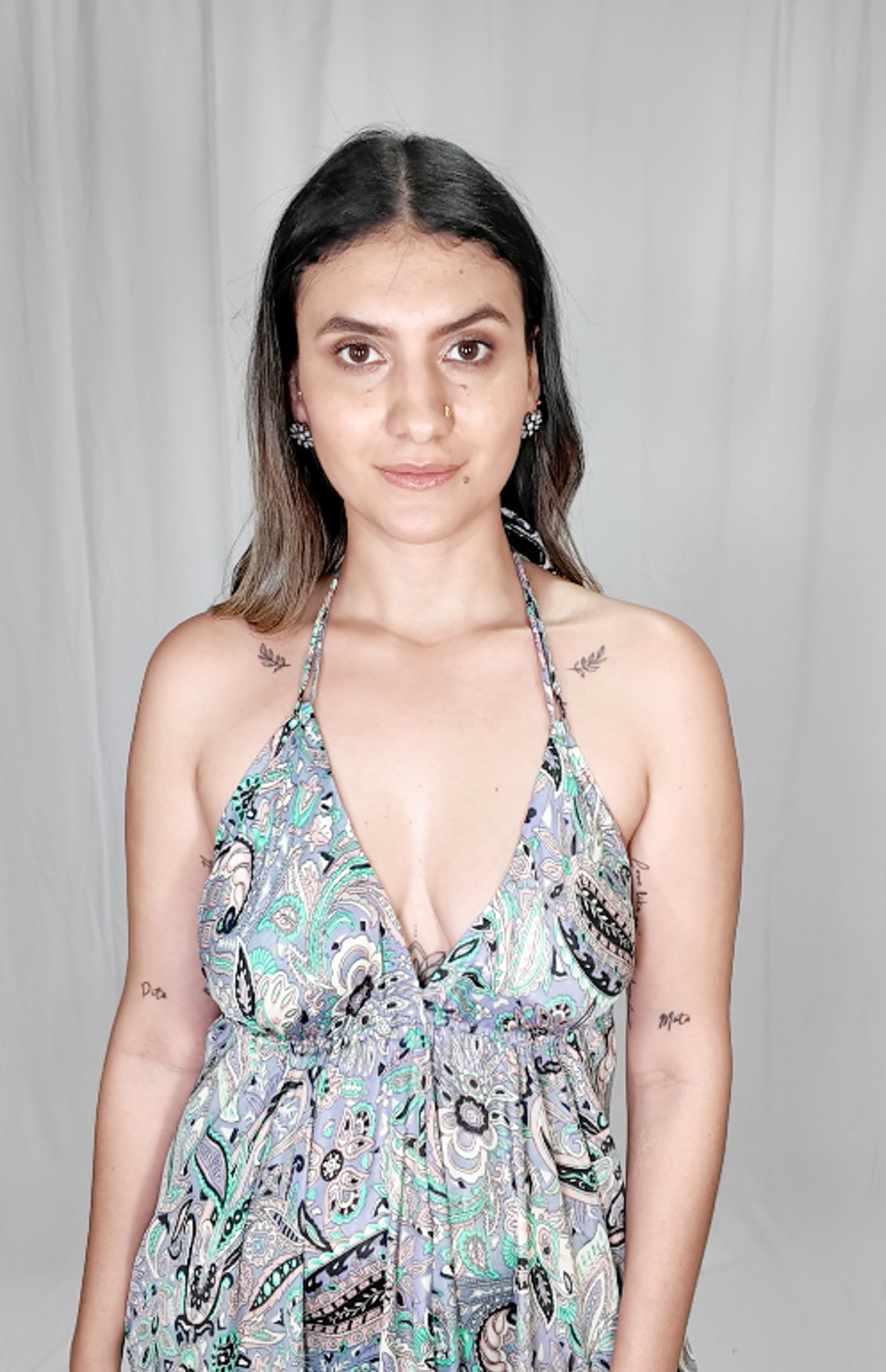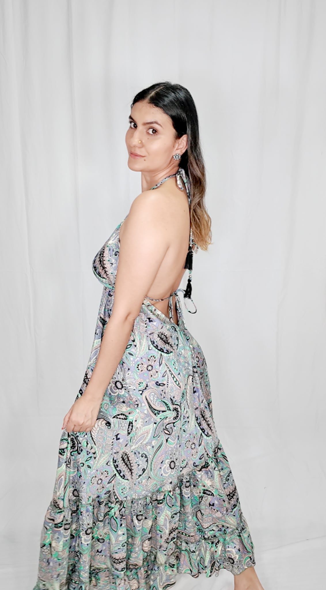 Vestido Largo con boleros en la parte de abajo, escote profundo en pecho y espalda, cordón de amarrado en cuello y espalda.