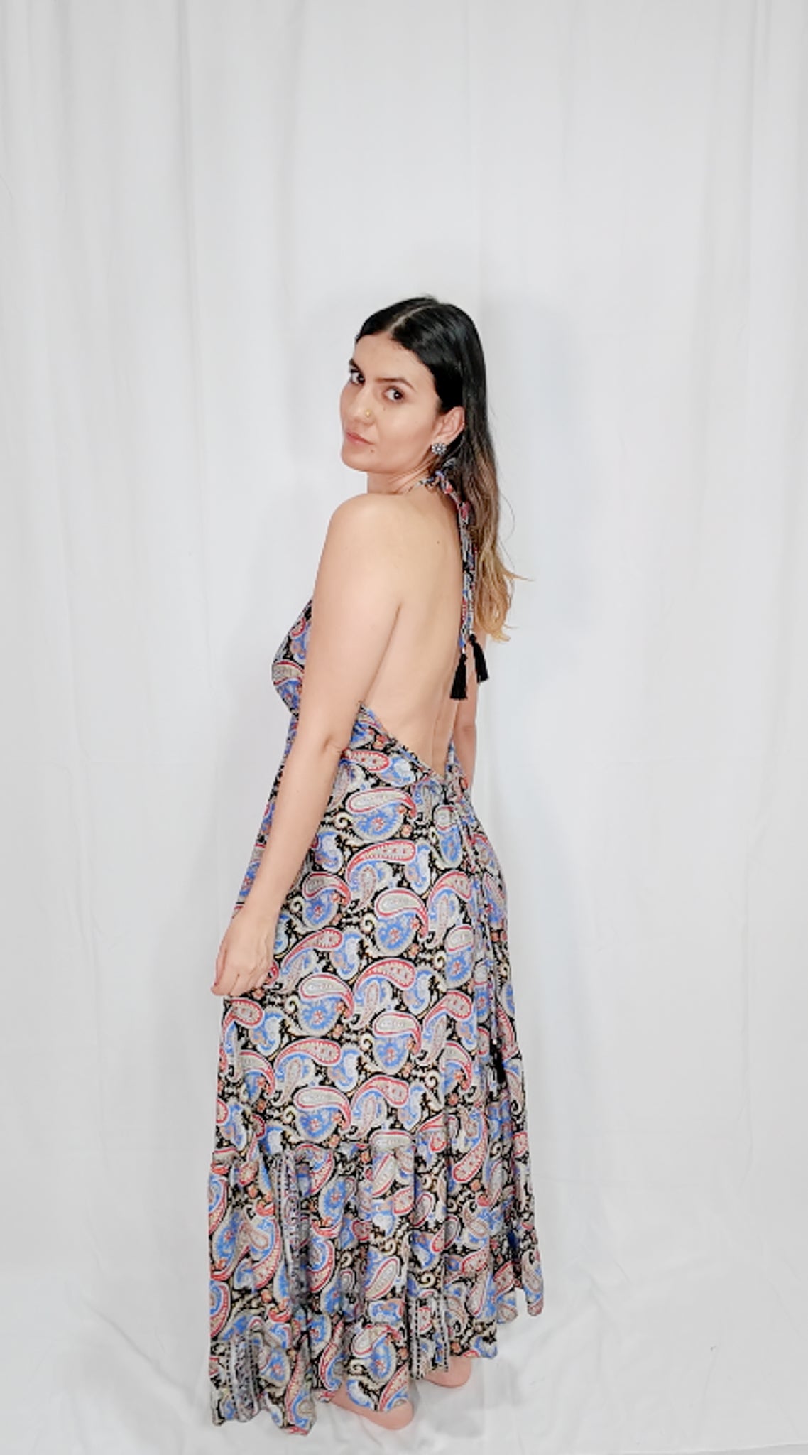 Vestido Largo con boleros en la parte de abajo, escote profundo en pecho y espalda, cordón de amarrado en cuello y espalda.