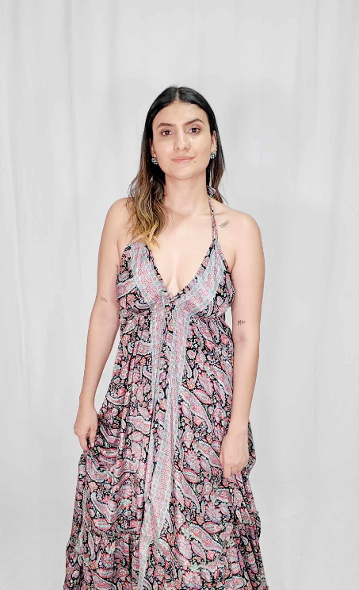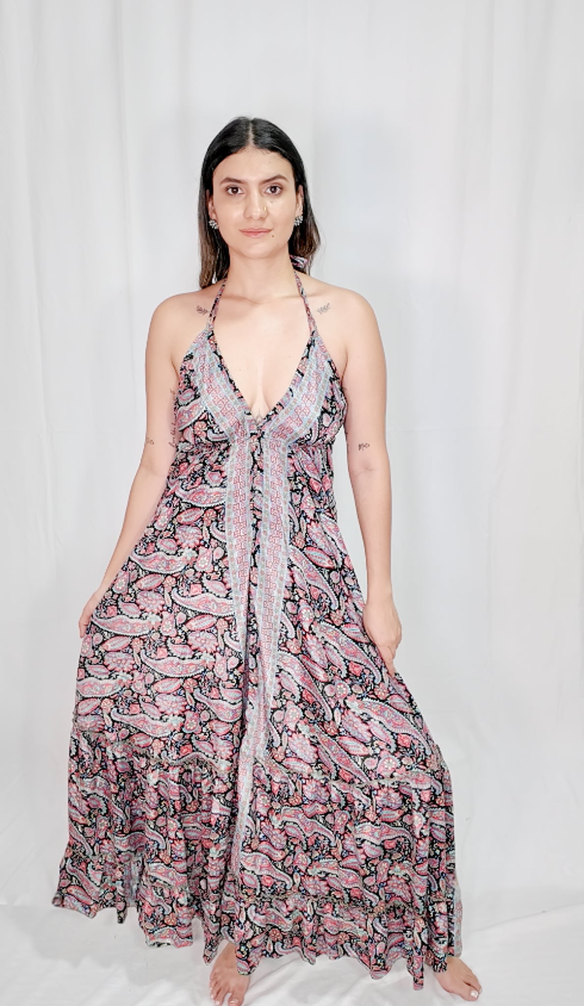 Vestido Largo con boleros en la parte de abajo, escote profundo en pecho y espalda, cordón de amarrado en cuello y espalda.