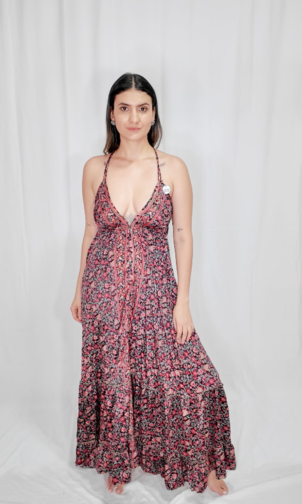 Vestido Largo con boleros en la parte de abajo, escote profundo en pecho y espalda, cordón de amarrado en cuello y espalda.